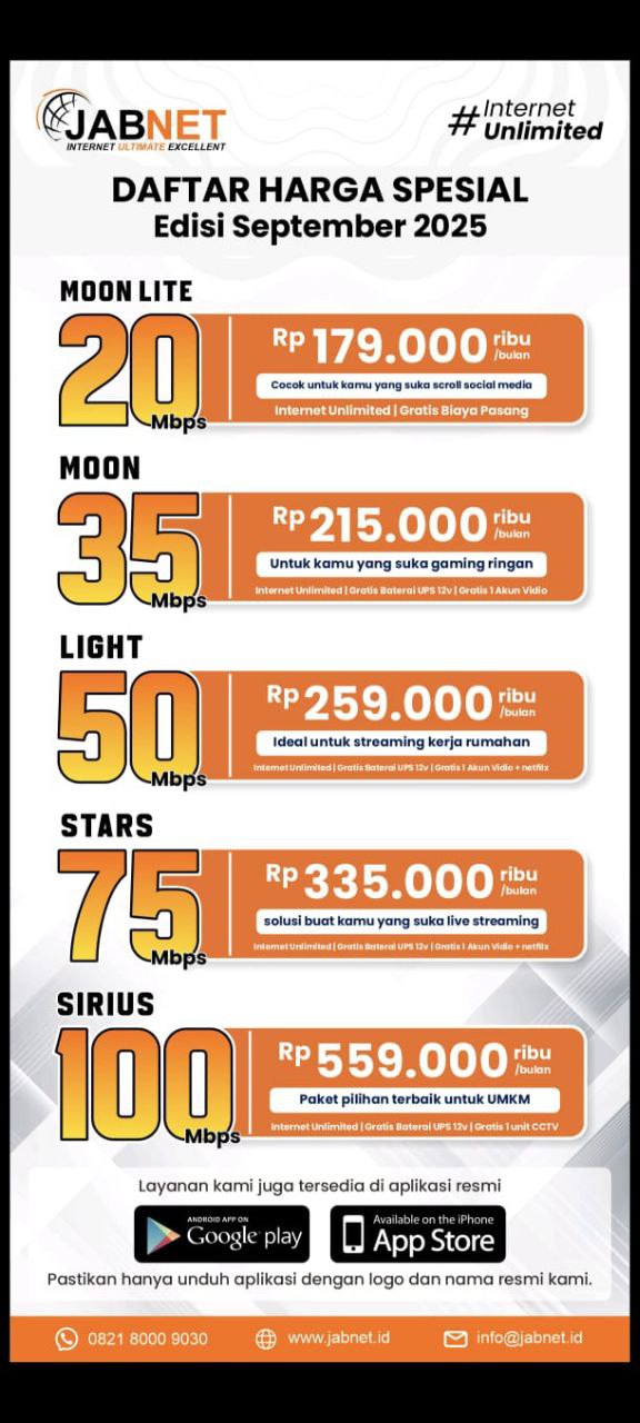 Layanan internet jabnet tidak dibatasi kuota, unlimited.